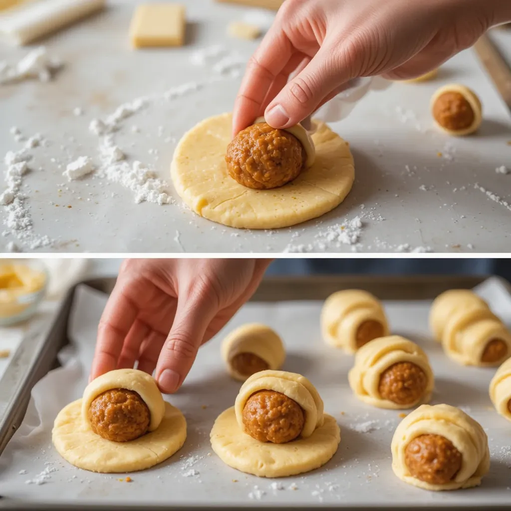- Divide chilled dough into as many pieces as sausage balls. Flatten each dough piece into a disc and wrap evenly around a sausage ball, sealing edges. Place on a tray.